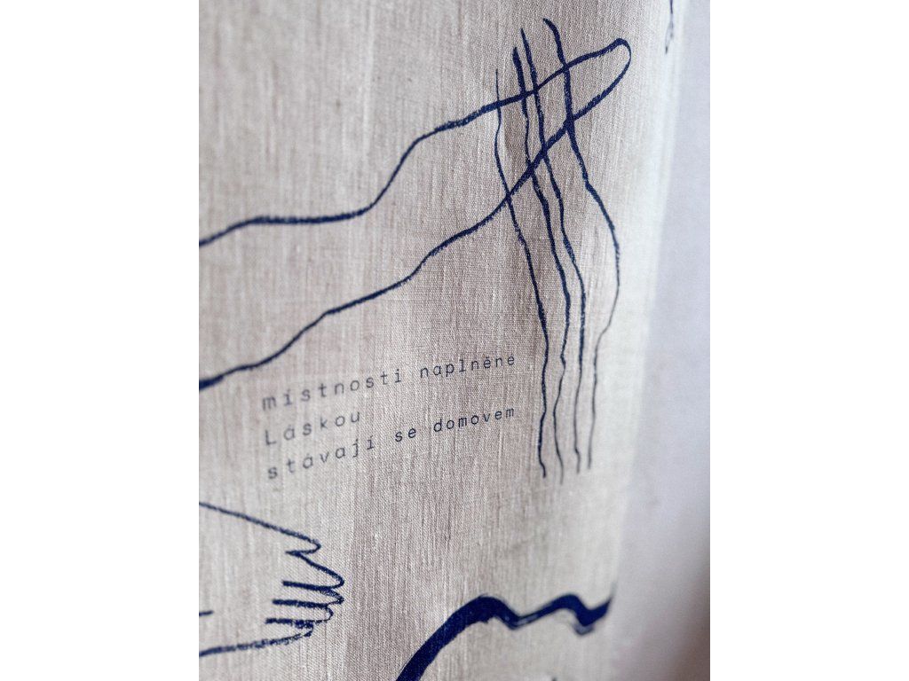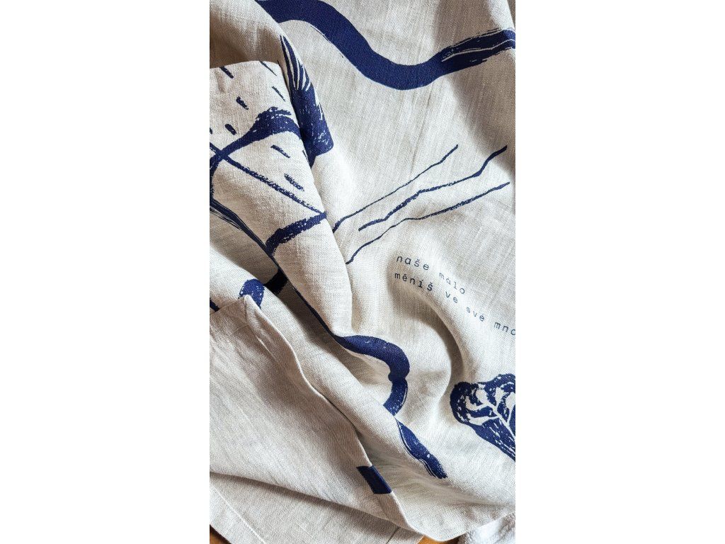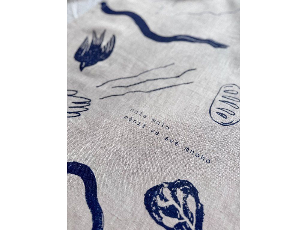 Materiál je přírodní len s certifikátem zdravotní nezávadnosti OEKO-TEX 100. Látka je předem vysrážená. Potištěný každý kousek zvlášť, ručně, sítotiskovou technikou.